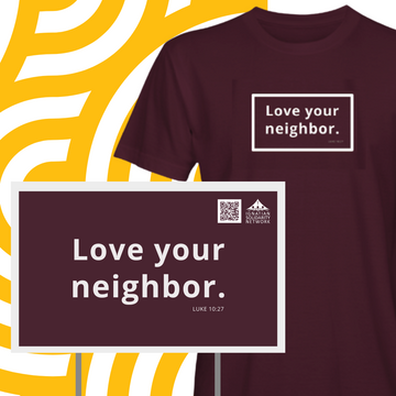 The gospel is clear: love your neighbors near and far. Share your love with our new ethically-made signs and shirts.
