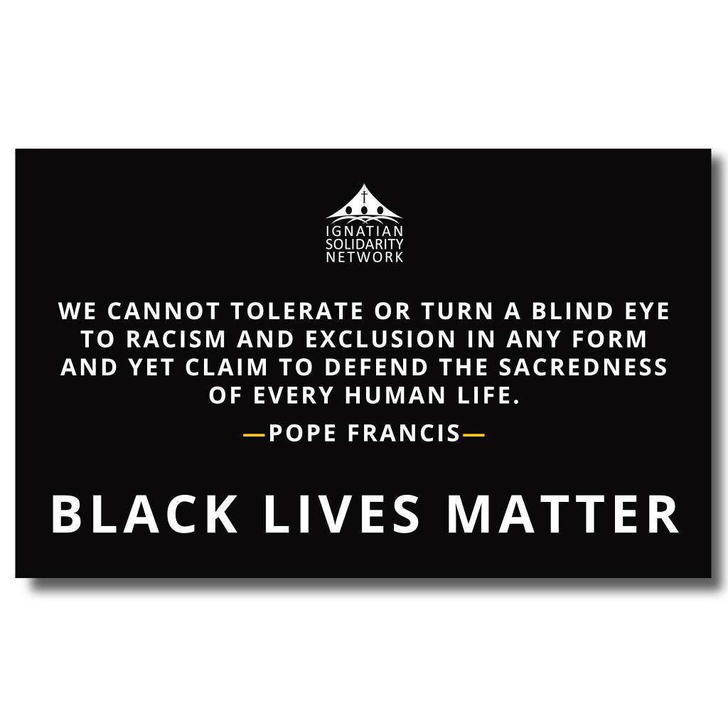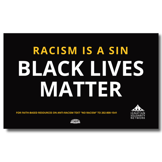 Black Lives Matter on front and Pope Francis quote regarding racism on the back. 18pt. The sign is made of a protected poster board and is 16"x26".