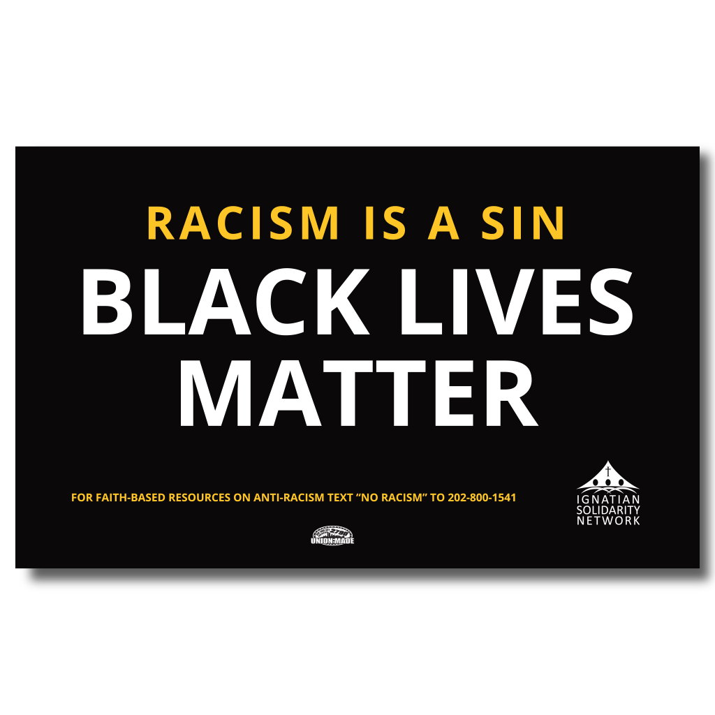 Black Lives Matter on the front with the Pope Francis quote regarding racism on the back. 18pt. The sign is made of a protected poster board and is 16"x26".