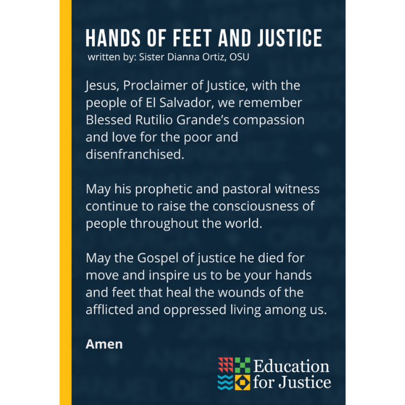 The prayer card lifts up in prayer Grande's "compassion and love for the poor and disenfranchised" is entitled "Hands and Feet of Justice" and was written by the late Sister Dianna Ortiz, O.S.U.