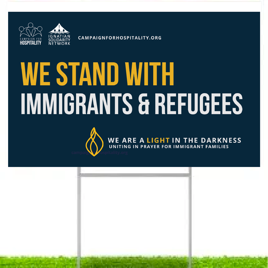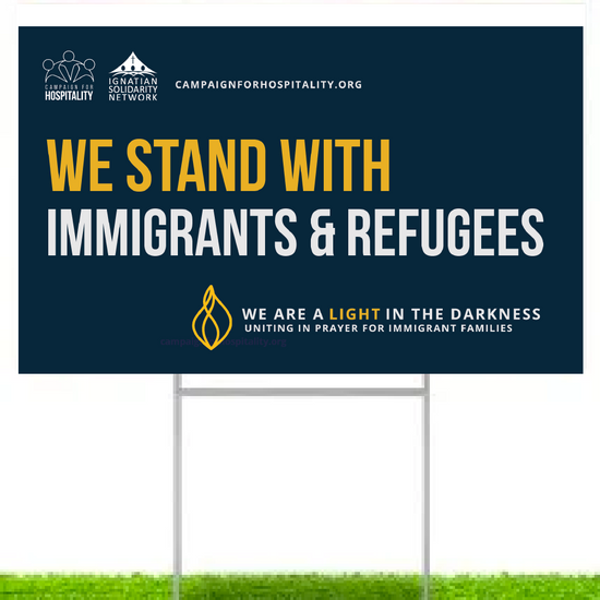 "We Stand with Immigrants & Refugees" on front and back. 18pt. White Poster Board 16"x26". Heavy-duty, high-tensile, spring steel wire frame measures 22.5" x 34".