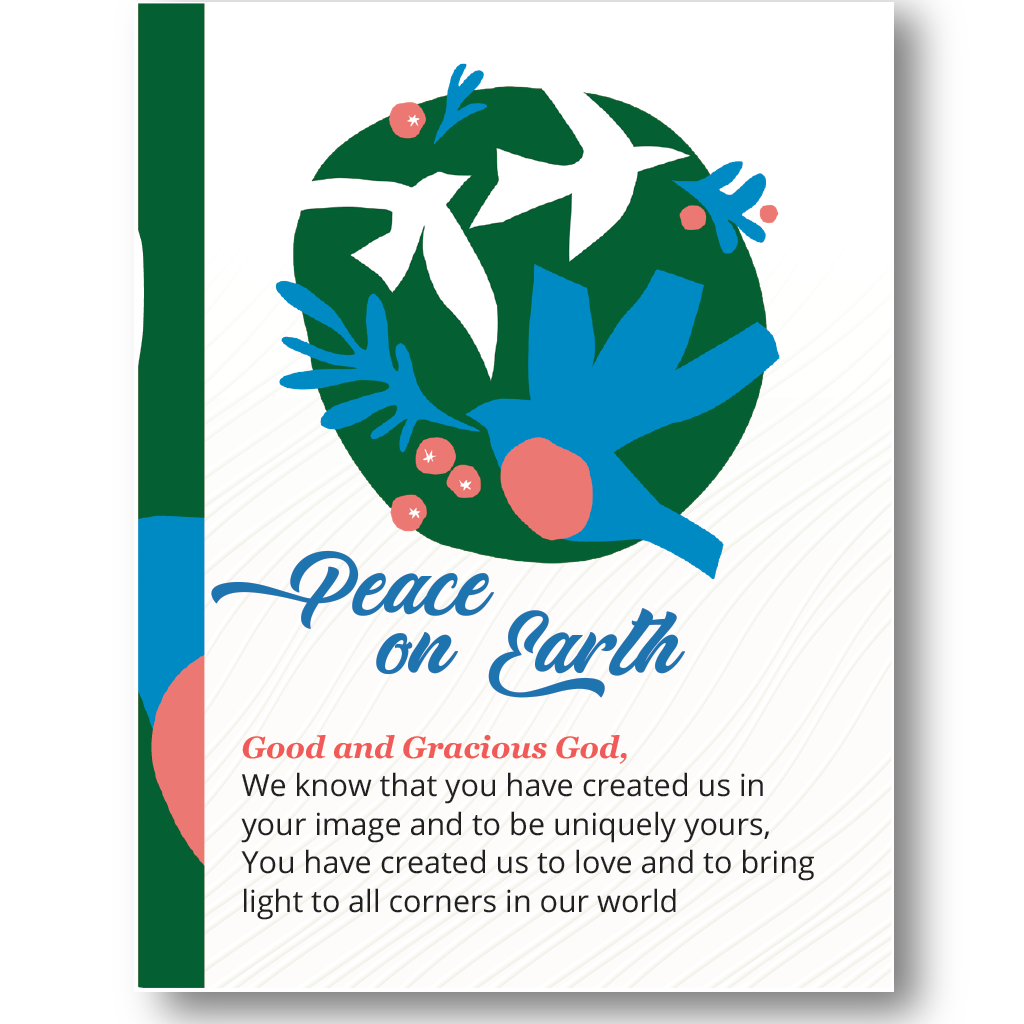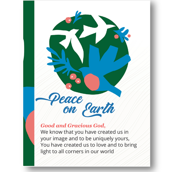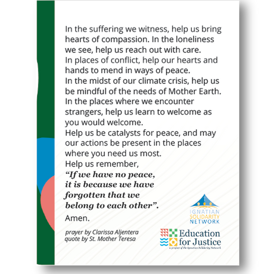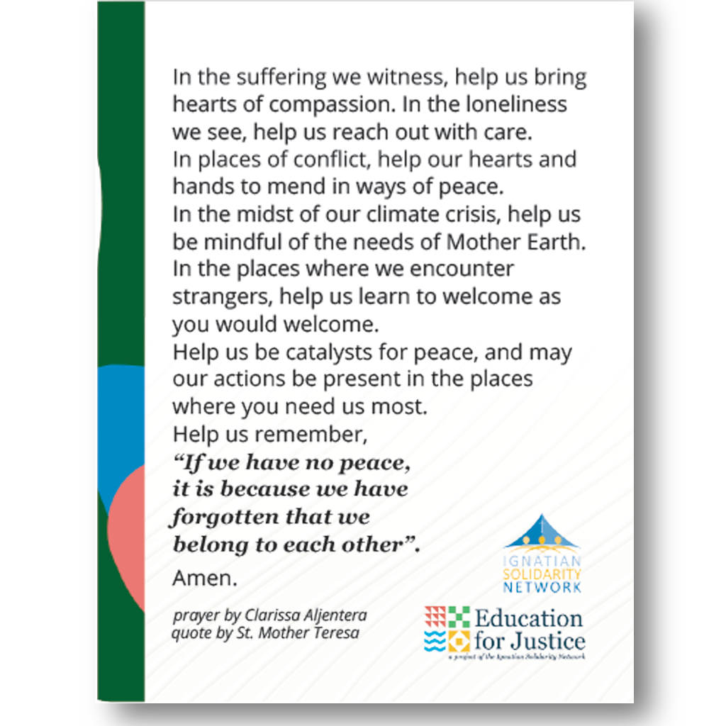 The prayer cards feature a prayer for peace created by Clarissa Aljentera, director of Education for Justice. Prayer cards are 3' x 4' and come in packs of 25.