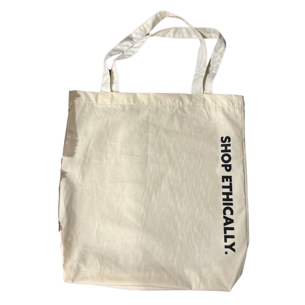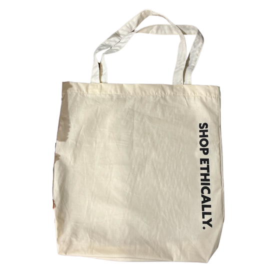 "Shop Ethically" is printed vertically on the front of the tote. This design is part of the Earth Day celebration items, along with the "Shop Ethically" unisex t-shirt and wool knit slouch beanie-colors.