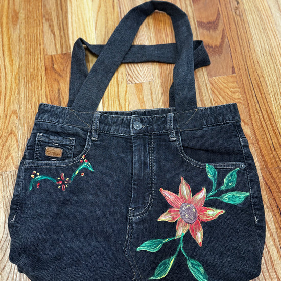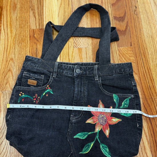 One-of-a-kind, handcrafted, and fully-functional denim handbag measuring 18 inches wide with the addition of hand-painted orange flowers.