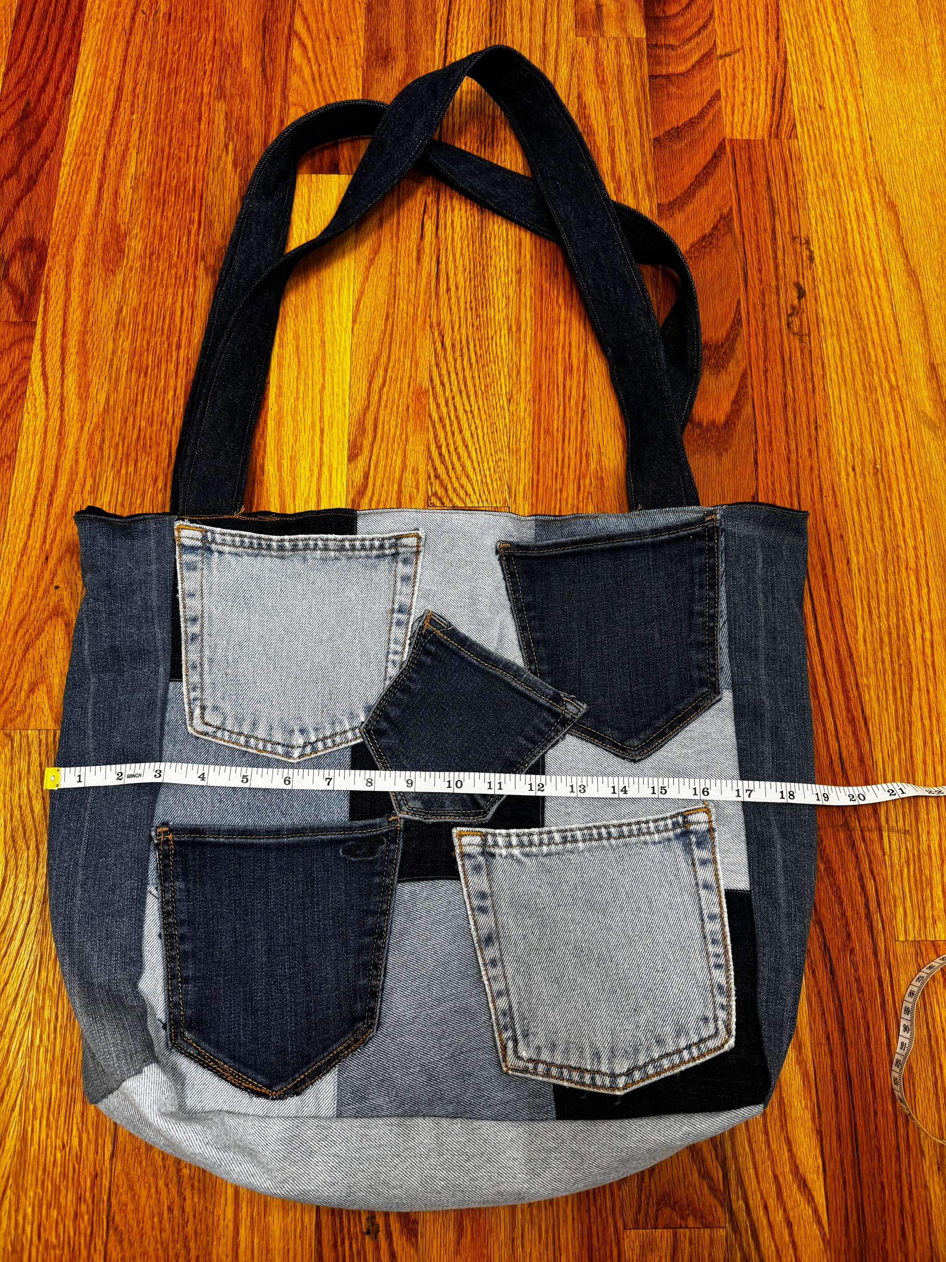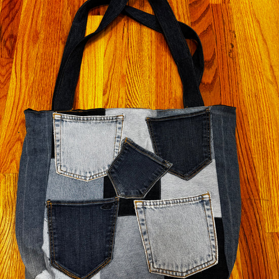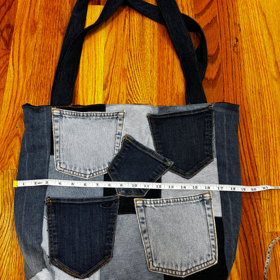 One-of-a-kind, handcrafted, and fully-functional denim handbag measuring 19 inches wide with the addition of multiple denim pockets in different washes.