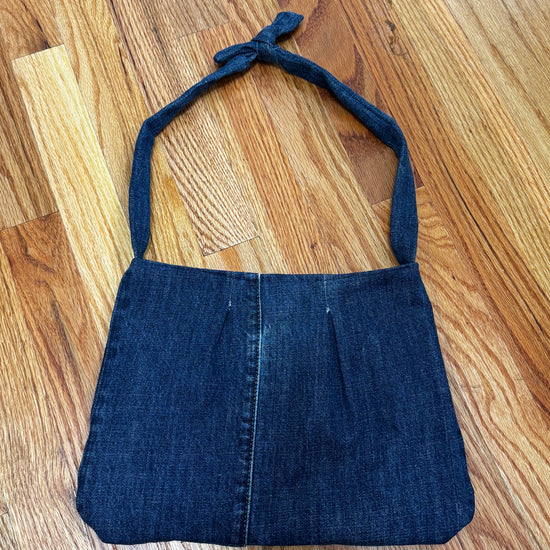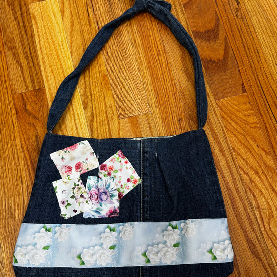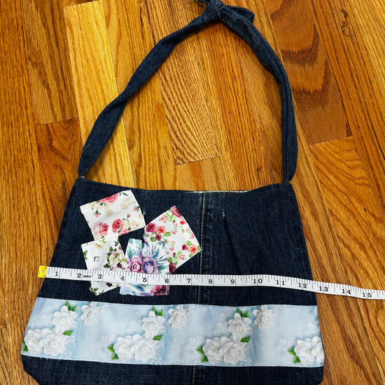 One-of-a-kind, handcrafted, and fully-functional denim handbag measuring 12.5 inches long with an addition of multiple floral fabric patches.