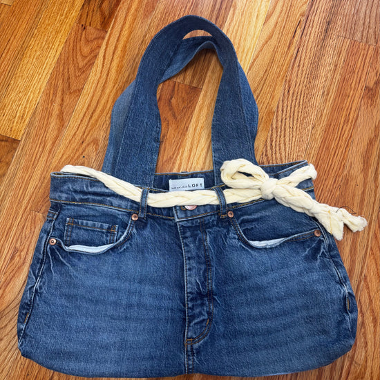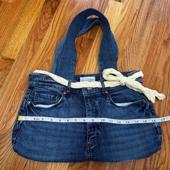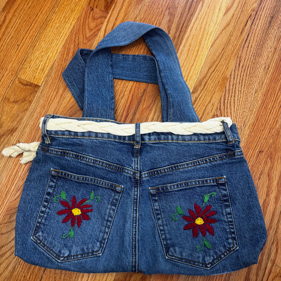One-of-a-kind, handcrafted, and fully-functional denim handbag measuring 16.5 inches wide with an addition of a cream scarf and embroidered flowers on the pockets.