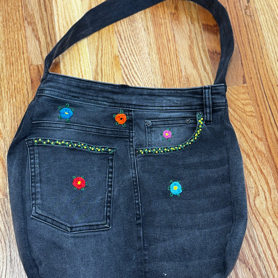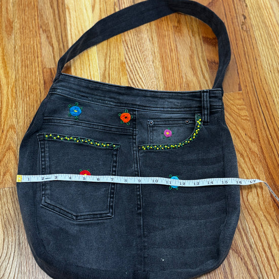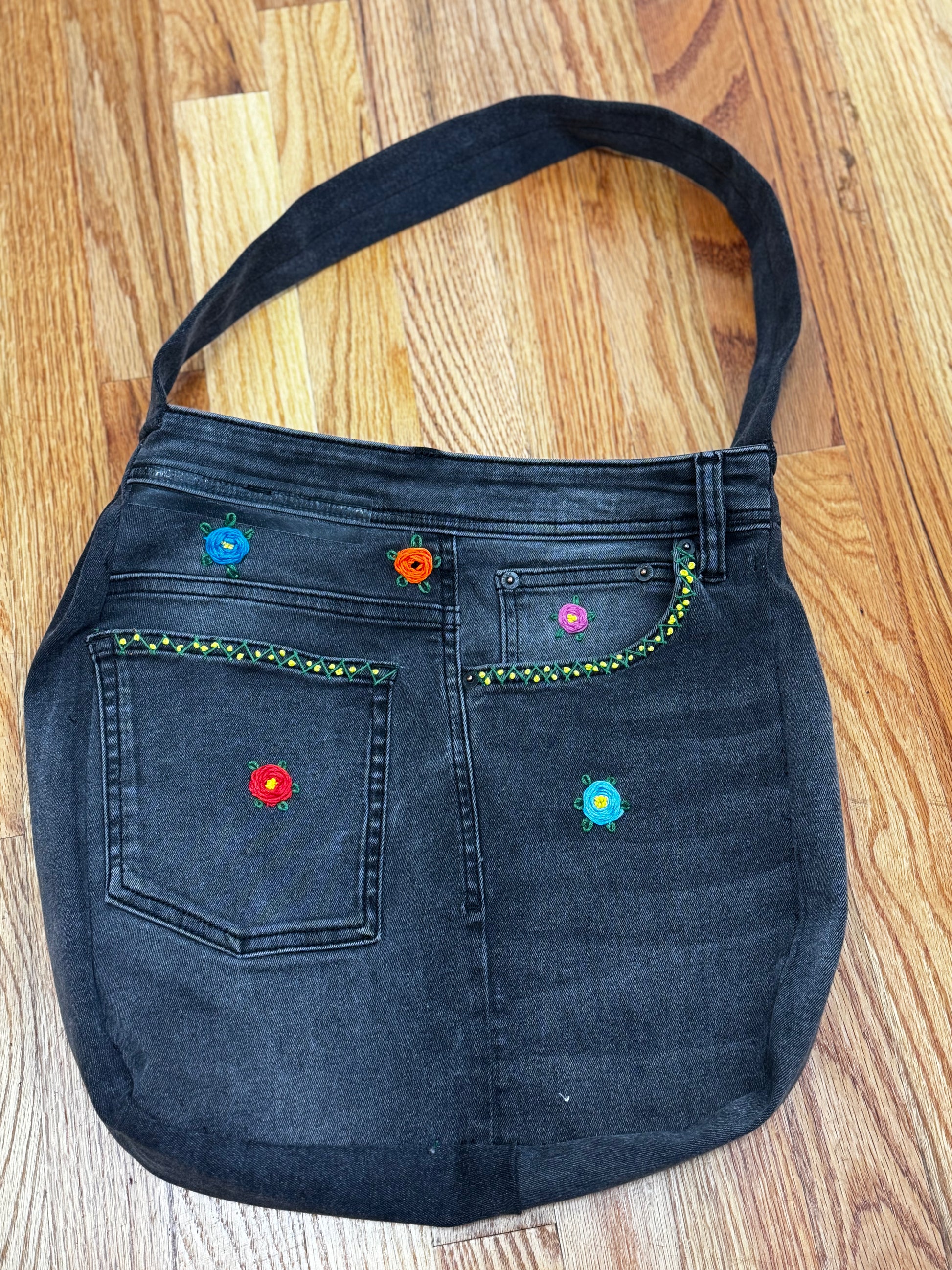 One-of-a-kind, handcrafted, and fully-functional denim handbag measuring 16 inches wide with the addition of embroidered flowers.