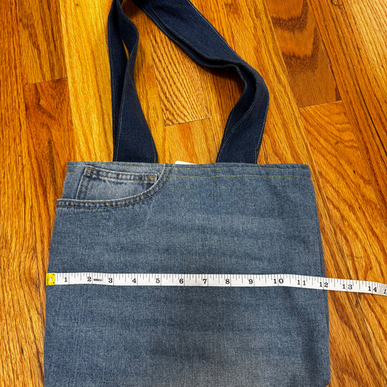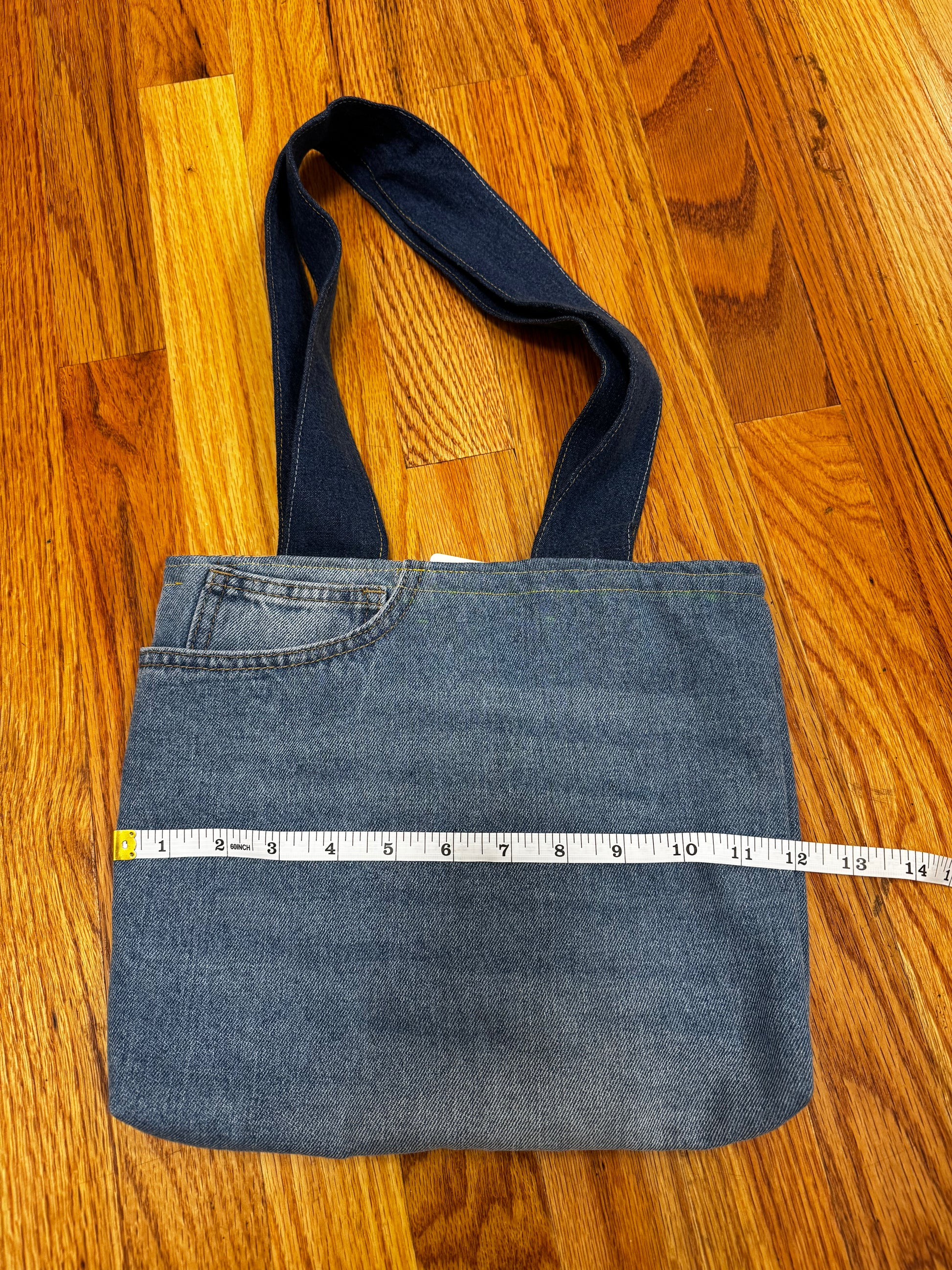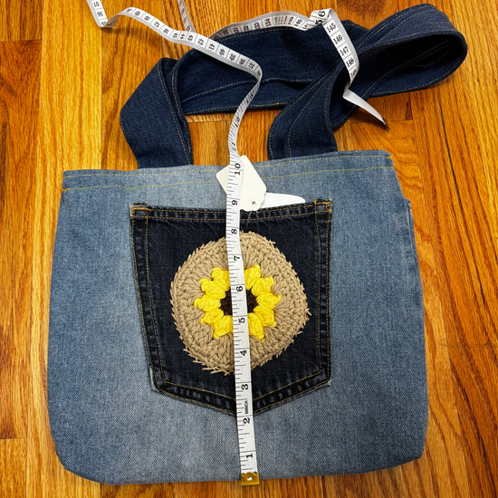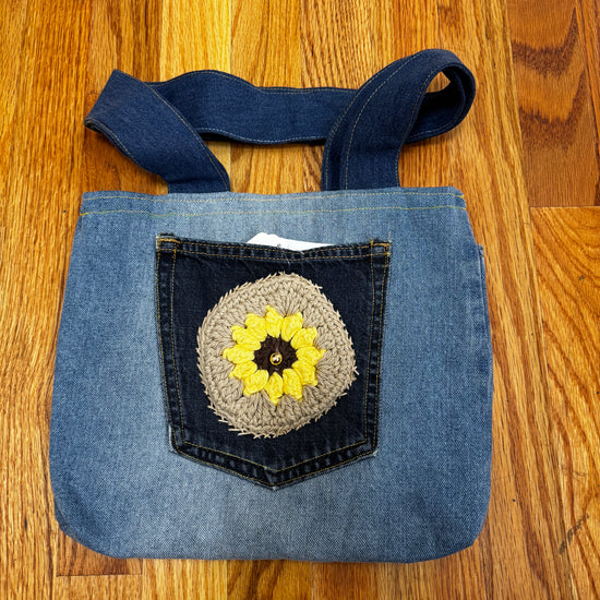 One-of-a-kind, handcrafted, and fully-functional denim handbag measuring 10x12 inches with an addition of a crocheted yellow flower on the front.