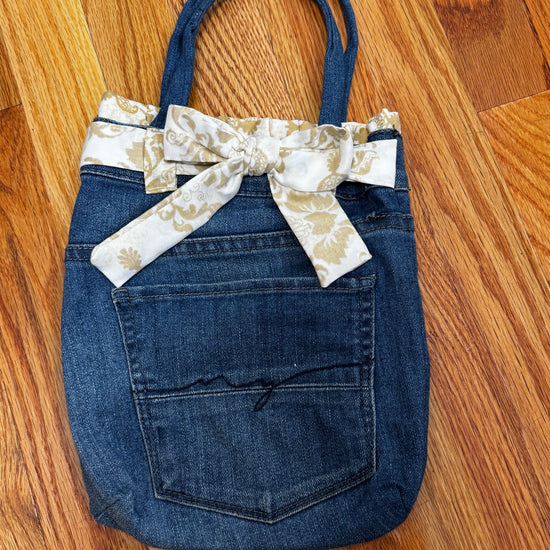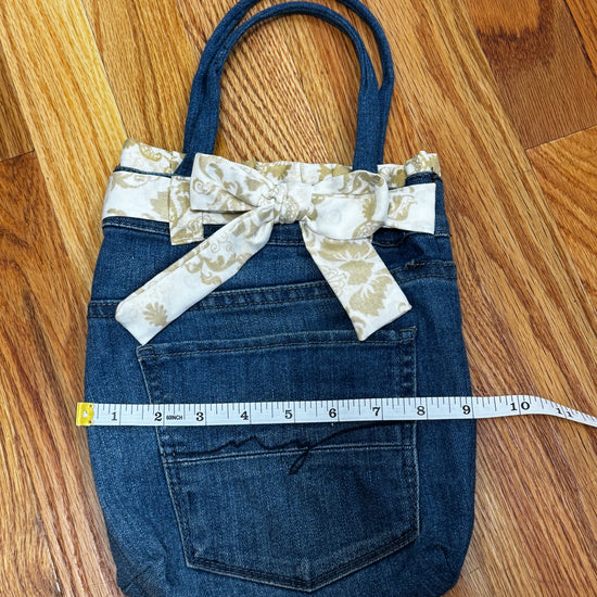 One-of-a-kind, handcrafted, and fully-functional denim handbag measuring 9 inches wide with an addition of a cream, patterned fabric bow.